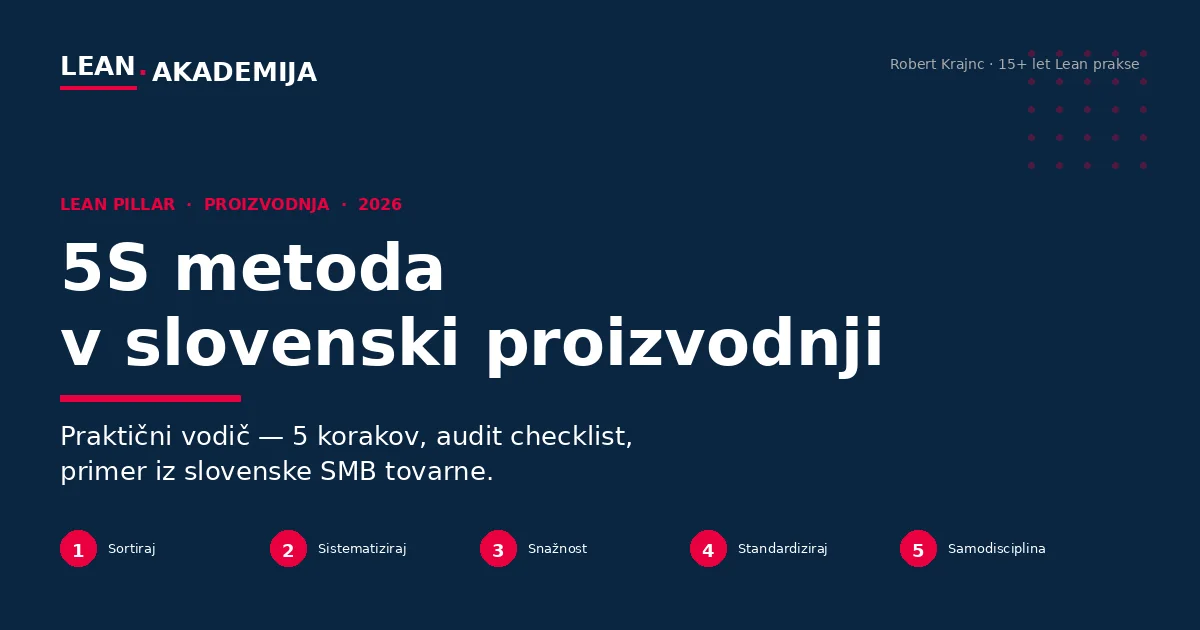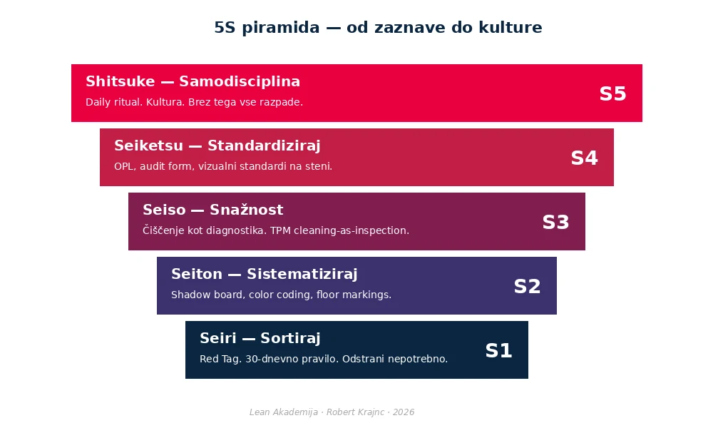 • Naš angle: v Sloveniji 5S najpogosteje propade na 5. koraku (Shitsuke / disciplina). 70-80 % implementacij razpade v 6-12 mesecih, ker management razume 5S kot enkraten projekt namesto kontinuirano kulturo.