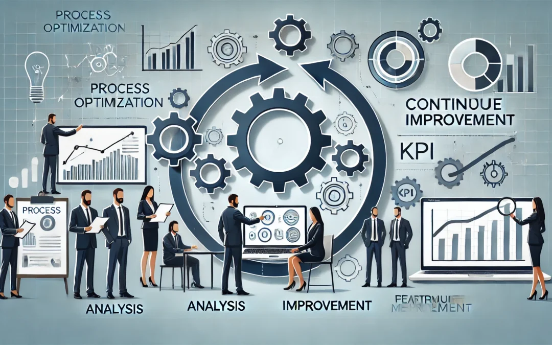“A modern and professional illustration showcasing the principles of process optimization. The design features interconnected gears, collaborative teamwork, flowcharts, and KPI metrics to emphasize continuous improvement, analysis, and efficiency in business operations. Ideal for enhancing productivity and streamlining workflows.”