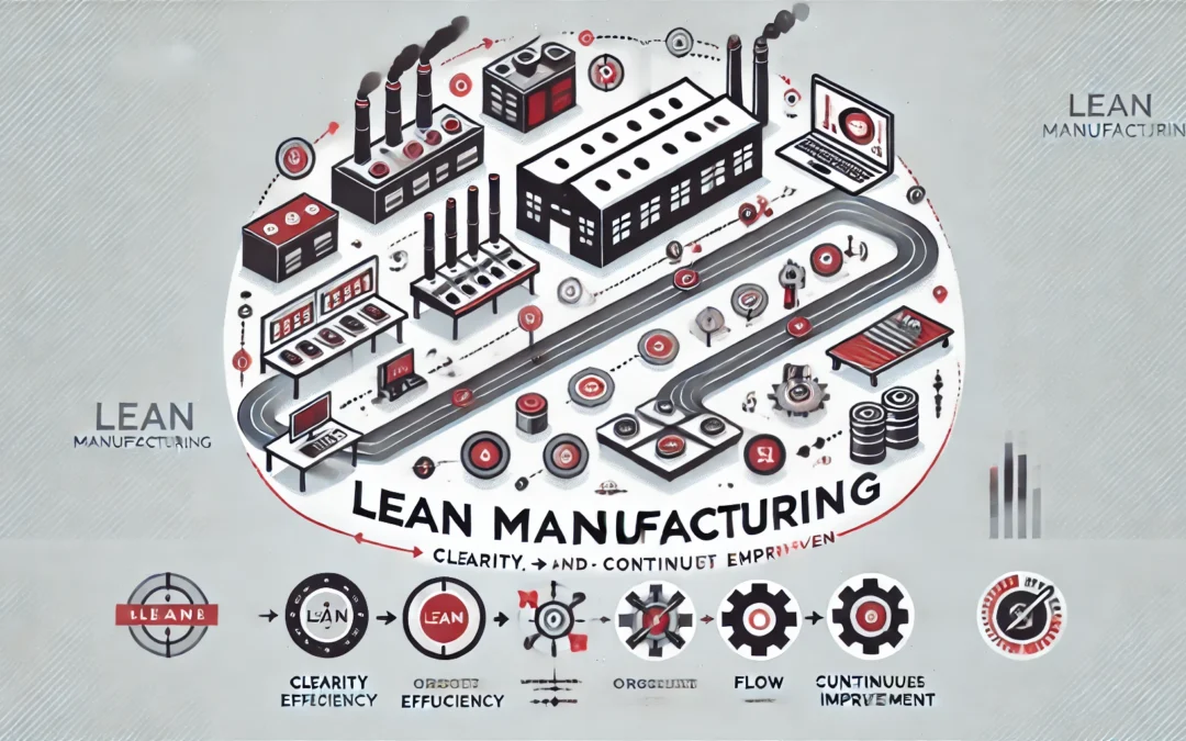 Vizualni prikaz načel vitke proizvodnje, ki vključuje proizvodne obrate, tekoče trakove, tehnologijo in ključne koncepte, kot so tok vrednosti, zmanjšanje izgub, izboljšanje učinkovitosti in stalne izboljšave za dosego optimiziranih procesov v industriji.
